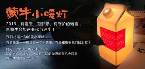 除了线下的行动,蒙牛在线上的温暖关怀也一直在进行。春节前夕,蒙牛乳业官方微博发起的“小暖灯”活动,将2012年的感动瞬间集合到一起,令人动容;蒙牛乳业官方发起的“点滴幸福,此刻最浓”春节回家活动,让网友在参与的同时,感受到了家的温暖。