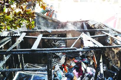 “居民楼门前起火了,来了三辆消防车! ”昨日下午2时许,记者接到市民报料后迅速赶到大连路22号6号楼前,路上停着三辆重型水罐车,消防官兵接起了一根100多米长的水带冲进居民小区。“这里还有明火!”记者顺着战士的呼喊看见,6号楼前一处占地约10余平方米的临时房被烧得只剩下几根房梁和柱子,石棉瓦全被烤塌陷落在地。消防官兵正站在高处向还在冒烟的屋内扫射。“那烟当时很大,都飘到五楼去了! ”目击者陈先生回忆道。