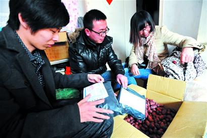 从前天开始,连续两天,王金凤的宁夏老乡们通过记者联系上了王金凤,他们利用周末的时间来到王金凤家帮忙。“我的家里很乱,照看小海还要卖枣,平时没时间打扫屋子,老乡们一来,我终于有时间收拾屋子了。”昨天中午,记者再次来到王金凤家,不到10平方米的小家已经整齐多了。王金凤的3名老乡正在擦拭着新疆红枣,帮她称重装袋,然后按照网店购物的地址发送快件。从早上9点忙到下午2点,3名老乡终于帮王金凤搞定了网店订购的红枣,并发出了第一批快件。