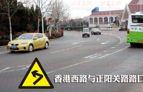 “前面路口有个急弯,开车可得慢点。”25日,根据袁师傅提到的几处危险路段,记者乘车来到其中之一的香港西路与正阳关路路口,在沿香港西路自东向西行驶到该路口时,右拐弯度极大的路口十分考验司机的驾驶技术。