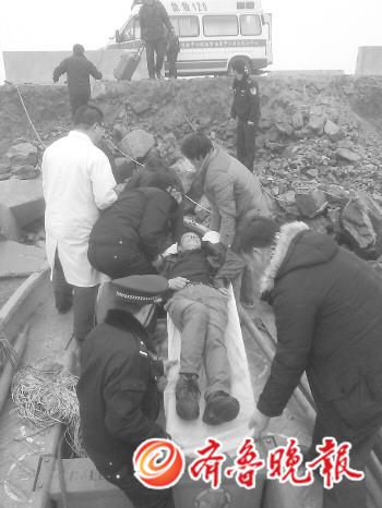 15时20分许,警车带领救护车到了现场,民警和消防员用无动力交通船将医护人员、医疗器械护送到“华勇起重1号”施工船上,医护人员查看病人病情后,决定将病人抬到担架上,民警和船上的人员迅速在施工船与无动力交通船之间搭了一个临时救援通道,由于临时通道狭窄、无动力交通船海上摇摆不定,营救人员冒着随时坠海的危险,在8名民警、消防员和热心市民张勇等人员的共同努力下,通过担架将病人抬到无动力交通船上并顺利靠岸,经过40多分钟的奋力营救,营救人员终将病人黄国庆抬到救护车上,用警车开道,护送救护车至董家口港区1号门外,前往医院抢救,为及时抢救病人的生命赢得了宝贵的时间。目前病人已经得到救治。(通讯员 薛冰 记者 赵波)