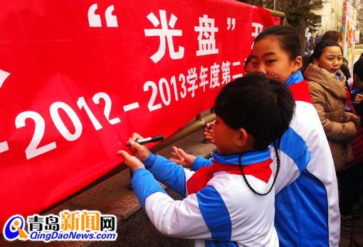 延安二路小学的同学在“光盘”行动的横幅上签名