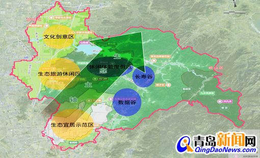 区:世园生态都市新区。总面积约194平方公里。空间布局为“一轴、两翼、六区”。“一轴”,即以世园会园区、森林公园和崂山水库为生态主轴,加强生态恢复与环境提升。东翼规划建设数据谷(信息产业)、长寿谷(健康养老)和休闲体验度假区。西翼规划建设文化创意区、生态旅游休闲区和生态宜居示范区。建设期为2012年至2025年。