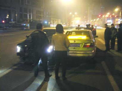 记者随后赶到现场发现,肇事的车辆依旧停在现场,车头已经被撞烂,车灯和前保险杠碎片撒了一地,与肇事车并排停在路中央的出租车车体向内凹陷,五六名目击者争着给出租车司机留电话为他作证。出租车上一名女乘客脖子受到了轻伤,正在等待救援。