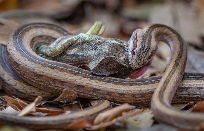 英国摄影师韦伯斯特拍摄这些照片时,这两只动物小心翼翼地移动着,但变色龙好像令蛇非常着迷。这条蛇突然扑上去,咬住变色龙,把致使瘫痪的毒液注射到猎物体内。韦伯斯特在近15年时间中一直拍摄视频,但主要是有关野生动物和旅游主题的。