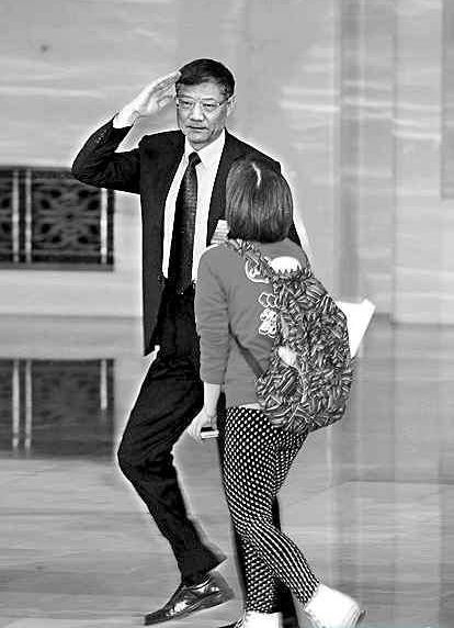 昨日下午,住建部部长姜伟新在入场途中被女记者“拦截”,他向记者敬礼后匆匆离去。 中新社发