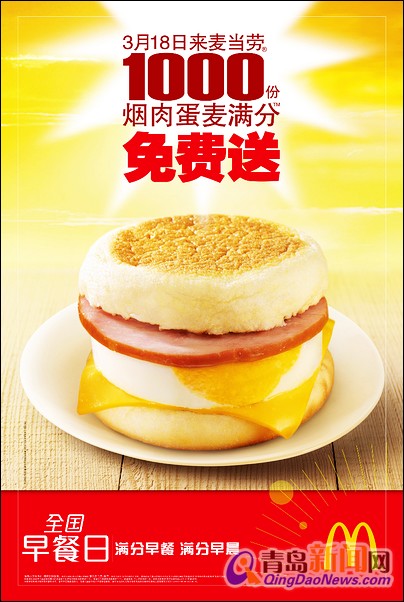 活动当天早餐时段,顾客可在活动指定餐厅免费领取烟肉蛋麦满分兑换券一张,3月18至3月21日均可于领券餐厅早餐时段兑换。据悉,青岛将有31家餐厅参与此次活动,大家可以前往就近餐厅提前了解相关信息,或关注麦当劳官网及官方微博了解更多活动进展。