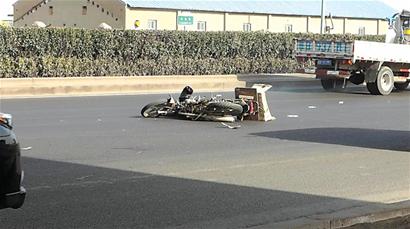 “环湾路胶州湾大桥入口附近,越野车撞了一辆摩托车! ”昨晨8时许,记者接到市民报料后赶到现场看见,在胶州湾