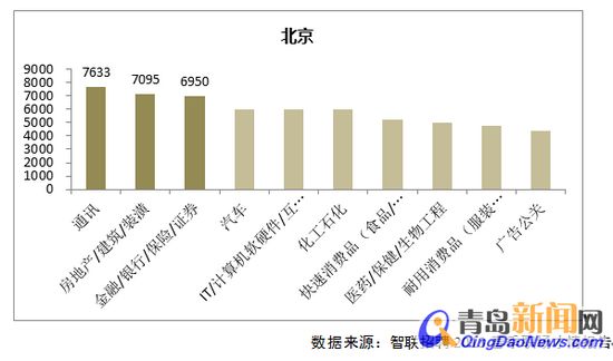 北京平均薪酬前三的行业依次是通讯业,房地产/建筑/装潢,金融/银行/保险/证券业,薪酬分别为7633元/月,7095元/月,6950元/月。