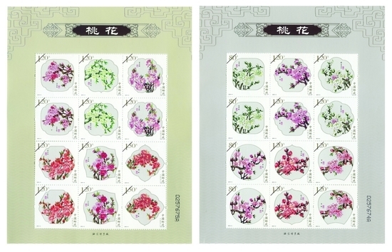 该套邮票的设计通过我国特有的桃花品种和古典园林中的花窗,采用工笔画技法,展示了桃花春意盎然的景象。邮票采用影写印刷方式,并加入香味油墨为辅,游走于方寸之间偶尔会发现那穿过洞窗的一枝横斜、疏花朵朵,幽香隐隐,散发着春的气息,给人以春天的惊喜。