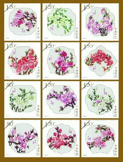 《桃花》特种邮票全套共十二枚,邮票名称分别为:白碧桃、单粉、品霞、
