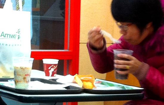 22日早上,记者来到了市北区某商超一层的肯德基。一进餐厅,果然有众多食客在用杯子喝粥,昔日装在专用碗中的米粥如今装在大杯里,确实有些古怪。一位售