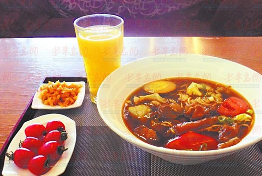 喝羊汤品红酒:青岛机场中图咖啡厅,一碗汤面,也就康师傅碗面那么大的量,里面飘着几粒牛肉粒,外带三个小柿子,四片辣白菜,67元,真黑!这是我吃过的最贵的汤面!