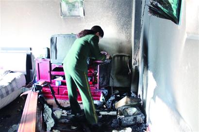 记者在现场看到,起火的南屋墙壁已经被浓烟熏黑,倒在地上的长沙发木质扶手被烧焦,旁边一个小太阳电暖器被完全烧毁,屋里的电视和电脑也被高温烤坏了屏幕。记者注意到被火烧得最严重的位置,两根电线从墙壁上耷拉下来,电视柜上还有个被烧坏的旧插排。消防部门的专家已经赶到现场进行勘查。租客小张告诉记者,小太阳电暖器已经很长时间没有用了,但可能一直连接在插排上没有拔。周围的居民称,老楼的电线以及都已经老化了,连接电暖器等大功率的家电就有些吃力,这次起火很可能跟电线或者插排短路有关。消防部门正在调查火灾的真正起因。(记者 黄飞 摄影报道)