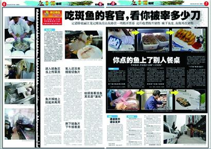 3月19日,《青岛早报》6、7、8版以《吃斑鱼的客官,看你挨多少刀》、《活斑鱼只是 “道具”》,报道了丽江龙记斑鱼庄山东路店存在欺诈消费者现象。“上来的只是半个鱼头?”“5斤的鱼就这么几块骨头?”“这些鱼片是所有的吗?”“我的鱼