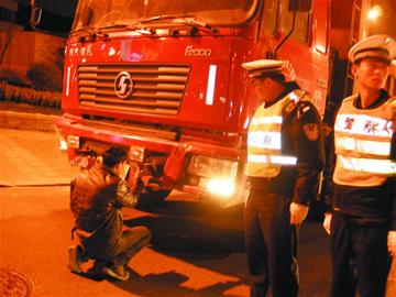昨晚,记者跟随崂山交警大队民警赶到辽阳东路与滨海大道设点夜查,9时20分许,一辆鲁BL6292大货车沿着辽阳东路西向东行驶到路口,民警发现这