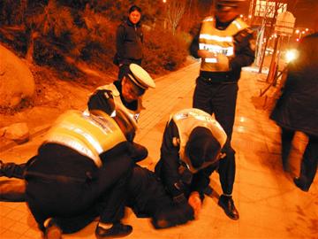 民警曲鹏、杨杰和两名同事赶紧追了上去,在追出去100多米后,上前抓住了男子。“你们放开我,快放开我。”该男子满嘴酒气,被民警当场摁倒在地上,看到自己无法逃脱,男子承认自己喝酒了。在远处的车边,还有一名男子大声称自己的右腿断了。其他民警发现车下还躺着一个人后,也跑了过去,并且拨打了120求助。记者赶到肇事车前看到,这辆黑色的鲁B82N5*比亚迪F6的两个气囊全部打开了,一名男子躺在右前轮下面不敢动弹。
