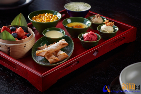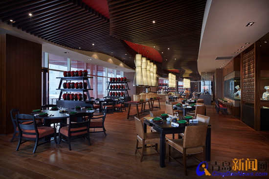 青岛本地渔民生活的细微之处淋漓尽致地体现出来,从木制的波浪形吊顶、星罗棋布的原木桌椅、现代感十足的鱼篓吊灯到门口整齐排列的大红锣鼓、鳞次栉比的茗茶瓷器以及古香古色的酒坛,传统而又不失时尚的丰富色彩带您领略别有风味的青岛格调。两间半开放式餐饮包房与开放式零点美食厨房毗邻,宾客可享受时尚惬意的开放式厨房带来的互动式乐趣,而其中的一间包房更可通过嵌入式玻璃橱窗近距离观赏鱼类游动的生动画面。