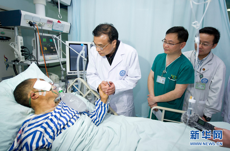 4月21日,中共中央政治局常委、国务院总理李克强来到成都华西医院,看望在这里接受治疗的芦山“4·20”地震危重伤员。新华社记者黄敬文摄