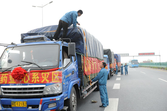 青岛新闻网4月23日讯 “你别拍我,我们就是想帮帮灾区,就是点面包和水。”22日下午,记者跟随华仁药业救援车队前往雅安震区,被一股股爱心暖意包围其中。