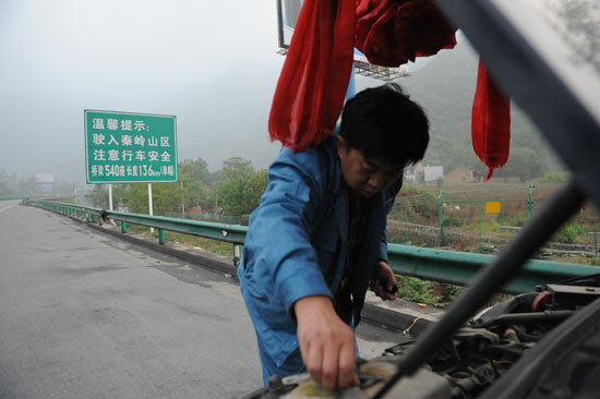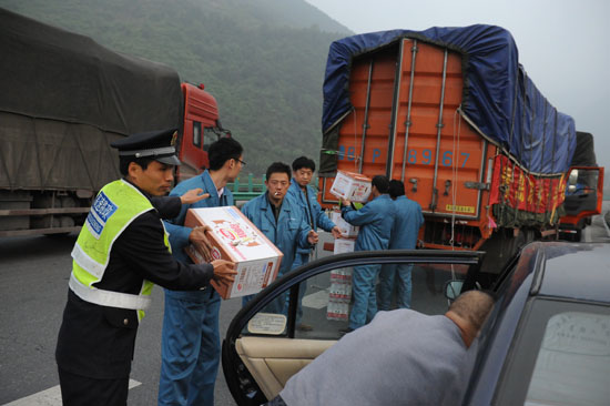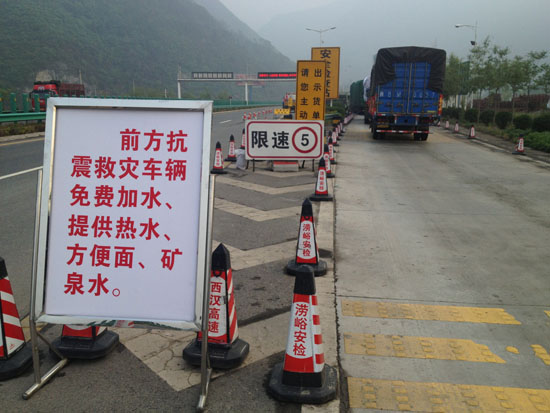 22日18时20分,救援车队进入秦岭货车检查站时,检查站的入口处设置了一处提示牌:“前方抗震救灾车辆免费加水、提供热水、方便面、矿泉水。”路边的陕西高速路政的工作人员见到我们的救灾车队后,不住地向我们挥手致意,并且提示前方可免费接受服务。