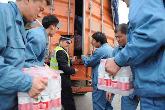 华仁药业的救援队员随即打开车厢,和陕西高速路政的工作人员排成一条队伍,将一箱箱矿泉水和面包递送到车厢里。