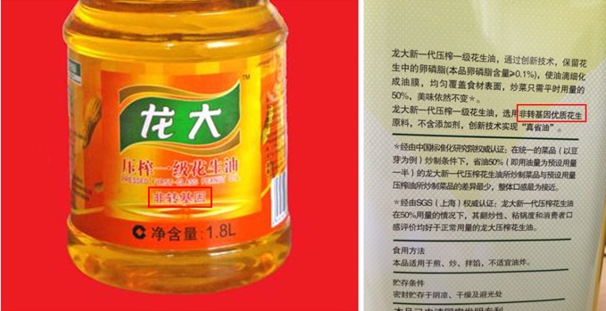 通常来说,食用油的非转基因或转基因的标注通常不是在正面就是在侧面或背面的说明里。其标准标注方式有两种,如山东龙大植物油有限公司的标注:龙大压榨一级花生油将“非转基因”以大号字体标注在瓶身正面。而龙大新一代花生油则在侧面说明里注明“非转基因优质花生”。