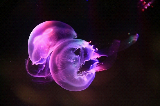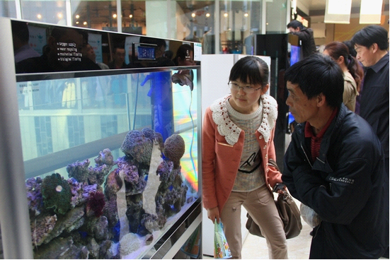 当日,国内首家以海洋牧场生态修复为主业的青岛龙宫海洋牧场生态修复工程有限公司同时揭牌,填补了我市无专业海上溢油、海底牧场生态修复公司的空白。近百只灵动人工养殖水母、珊瑚与百幅海洋主题诗画营造美伦美焕海底景象让观众惊叹海底牧场生命和谐的精彩。(青岛新闻网记者侯晓华 摄影报道)