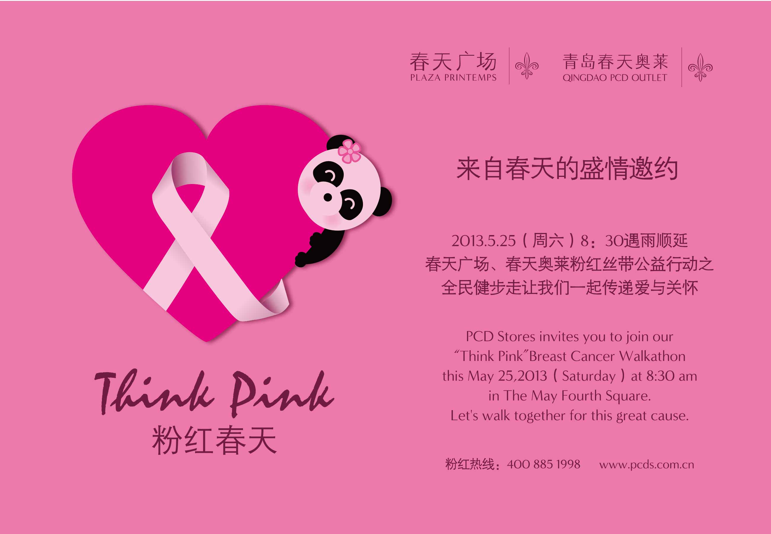 5月25日,让我们相约五四广场吧!我们诚邀您穿上最温馨的粉红色服饰来表达您的“粉红爱心”。让我们一起,在明媚春光中,向健康、美丽、自信健步出发!