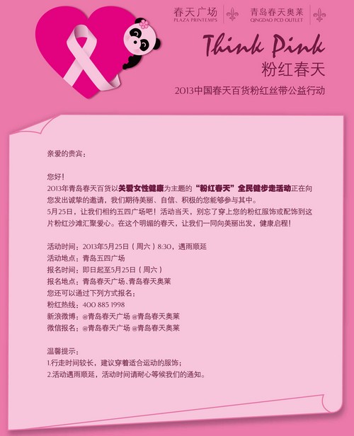 2013年青岛春天百货以关爱女性健康为主题的“粉红春天全民健步走活动”正向您发出诚挚的邀请。