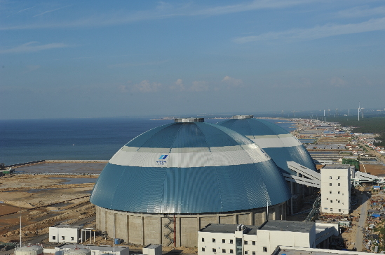 在电厂内,有两个圆形封闭煤场是厂区的标志性建筑。它们总投资1.6亿元,储煤量达36万吨,足可供应全厂20天所用。“别的地方一般建的是条形煤场,投资只需要2千多万元,我们这个封闭煤场可谓国内最大、全国首创、国际领先。”工作人员说,莱州湾风力较大,投巨资建造这个封闭煤场,一是防止粉尘飘散对环境造成污染;再者减少煤的损耗,节约开支。传统老火电厂向“高效生态”的转型,还体现在除尘技术。工作人员介绍,电厂采用高效静电除尘技术,除尘效率达99.85%,脱硫效率达95%,大气污染物排放浓度优于国家最新环保标准。