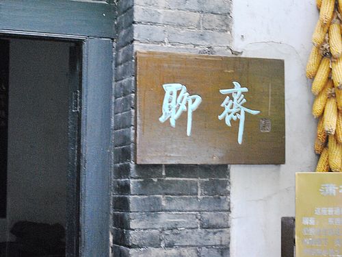 顺着蜿蜿蜒蜒的石板路来到蒲松龄故居,一座具有典型北方农家院落风格的故居。院子内三棵古槐盘根错节耸立路边,荫翳天日,一下子把人带进《聊斋志异》的情境之中,天空中飘洒的淅沥小雨也更添了几分神秘氛围。故居正房为砖石、土坯结构的普通民房,木棂门窗,房内路大荒手书的“聊斋”匾额迎门高悬,匾下悬挂着蒲松龄的照片。