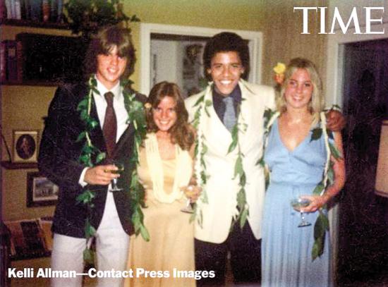 奥巴马和中学女友米根(右一)、最好哥们格雷格(左一)及女友的中学毕业合影照