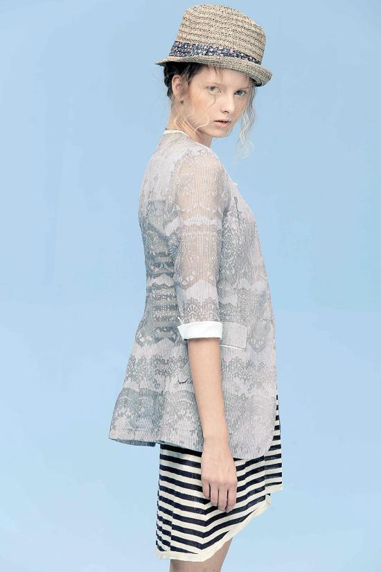 浅蓝色通花外套搭配条纹裙装,扑面而来的海洋感。(谜底)