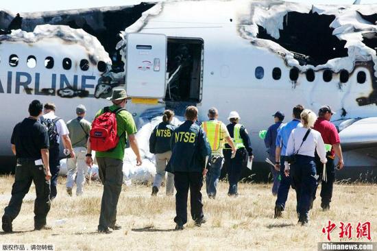当地时间7月7日,美国国家运输安全委员会(NTSB)在韩亚航空214航班坠机现场开展调查工作。