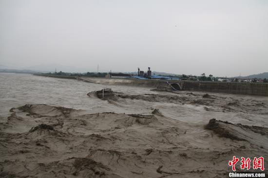 7月9日上午11时20分左右,由于上游暴雨导致盘江河水迅速上涨,水势凶猛,四川江油青莲镇盘江大桥发生垮塌,多台车辆落水。中新社发 杨超 摄