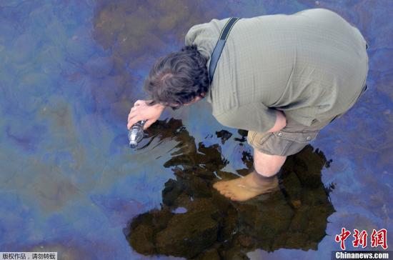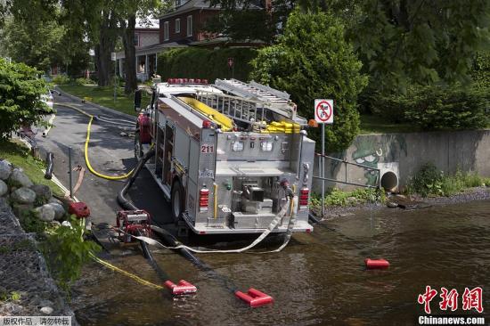 当地时间7月9日,加拿大Lac-Megantic,油罐列车出轨爆炸两天后,泄漏的油流入河流中。当地派出消防车等设备和人员进行清理。