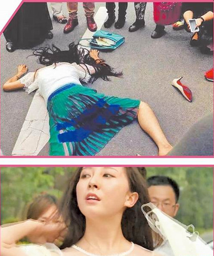 广告中女主角车祸后脸朝下摔地(上图),敷面膜后脸竟完好如初(下图)。图片来源:台湾《苹果日报》
