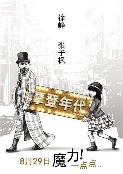 在海报中,一身老派魔术师打扮的徐峥痞气十足,回头张望童星张子枫的眼神也颇有些不耐烦,张子枫则亦步亦趋跟着,丝毫不敢松懈。海报上两人扛着的“魔术道具”箱上恰好就是《摩登年代》的片名,黑白卡通风格的画面,则洋溢着一股复古Style,同时也是在向喜剧大师卓别林的经典幽默片名作致敬,资深影迷一定会由此引发会心的一笑。
