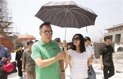 16日,陈凯歌、陈红夫妇来到湖北省襄阳市察看唐城影视基地建设情况。陈红甘做陈凯歌“背后的女人”,不仅为陈凯歌打伞遮挡阳光,还贴心地为陈凯歌扯着被汗水浸透的衣服。