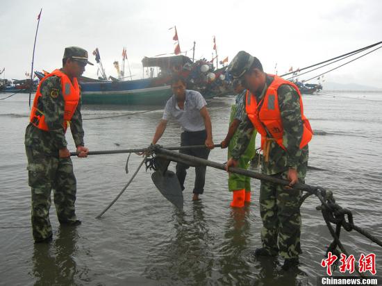 今年第8号热带风暴“西马仑”7月18日下午逼近闽南地区,闽南和台湾浅滩渔场出现9级阵风,风暴中心经过的区域短时阵风10级。在福建省漳州市漳浦县六鳌镇,边防官兵帮助渔民加固锚绳。中新社发 陈木河 摄