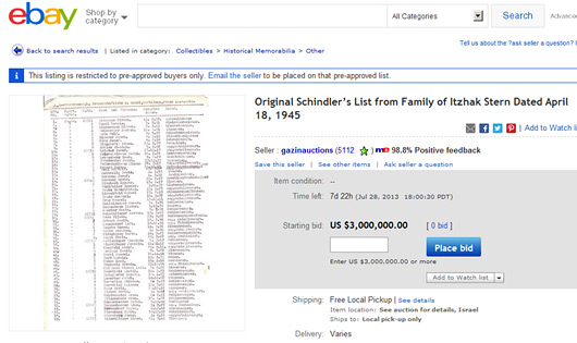 辛德勒名单文件目前正在eBay网站以300万美元起价拍卖。