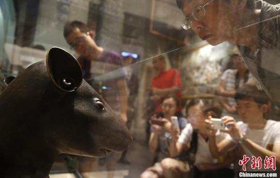 7月19日,游客被北京中国国家博物馆展出的圆明园兽首吸引。作为国博《复兴之路》基本陈列的一部分,法国皮诺家族捐赠的圆明园青铜鼠首兔首被放在展览的第二单元——“帝国主义列强对中国的侵略”部分与公众见面。中新社发 刘关关 摄