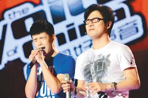 选手张恒远(左)与导师汪峰在第二期节目中合唱