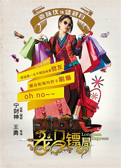 此次《龙门镖局》首度曝光的人物海报,颇为符合宁财神一贯的无厘头风格,主演袁咏仪等虽然身穿古装,但名牌包、化妆品、高跟鞋、黑超眼镜、雪茄、跑车、高尔夫球、手机甚至iPad等流行时尚装备一样也不少。