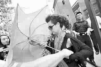 ■梦鸽在庭前会议结束后走出法院大楼,用雨伞遮挡记者拍照 张媛摄