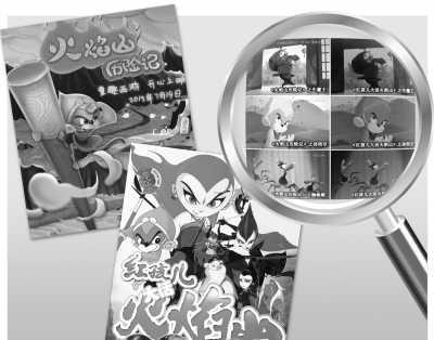 从左至右:《火焰山历险记》海报、《红孩儿大话火焰山》音像制品封面、媒体记者对两部影片相似场景的对比。