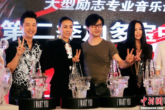 6月17日,第二季《中国好声音》启动发布会在上海举行。庾澄庆、那英、汪峰、张惠妹(左起)作为第二季导师集体亮相上海。中新社发 汤彦俊 摄
