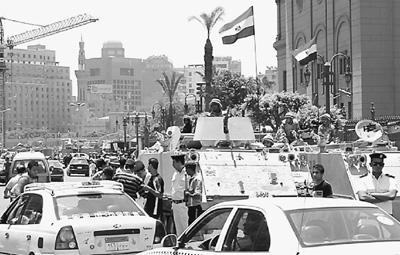 7月26日,埃及军方在开罗解放广场入口部署装甲车。