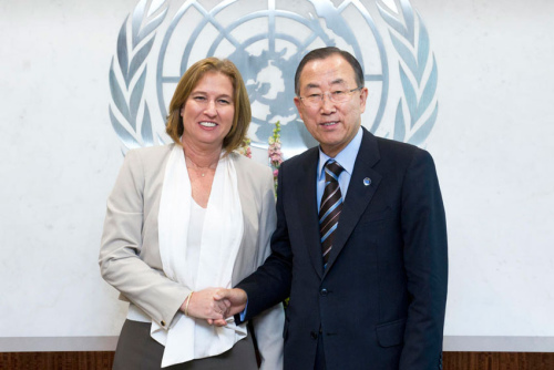 联合国秘书长潘基文在纽约总部会见以色列首席谈判代表、司法部长利夫尼。